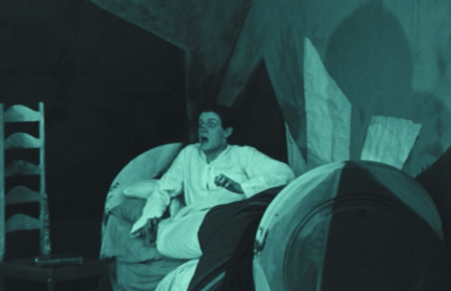 The frame quickly dissolves into a scene of a new character, whom we’ll soon learn is Alan (Hans Heinrich von Twardowski), overjoyed about his town’s fair. He goes to Franzis’s place to convince him to join. Franzis is clearly a pre-traumatized, lighter, and happier version of the man we met in the opening scene. Meanwhile, Dr. Caligari is trying to get a permit for the same event.